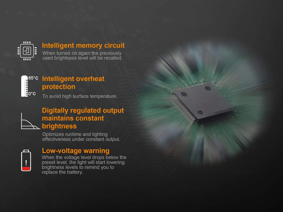 *Powered by one rechargeable 18650 Li-ion battery or two CR123A Lithium batteries
